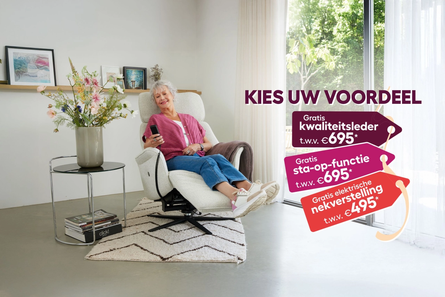 Wilt u thuis in uw eigen woonkamer een sta-op-zetel of relaxfauteuil uitproberen? Bij Meubelzorg komen wij geheel vrijblijvend en gratis bij u langs, zodat u de zetels kunt uitproberen. Plan hier een thuisdemonstratie.